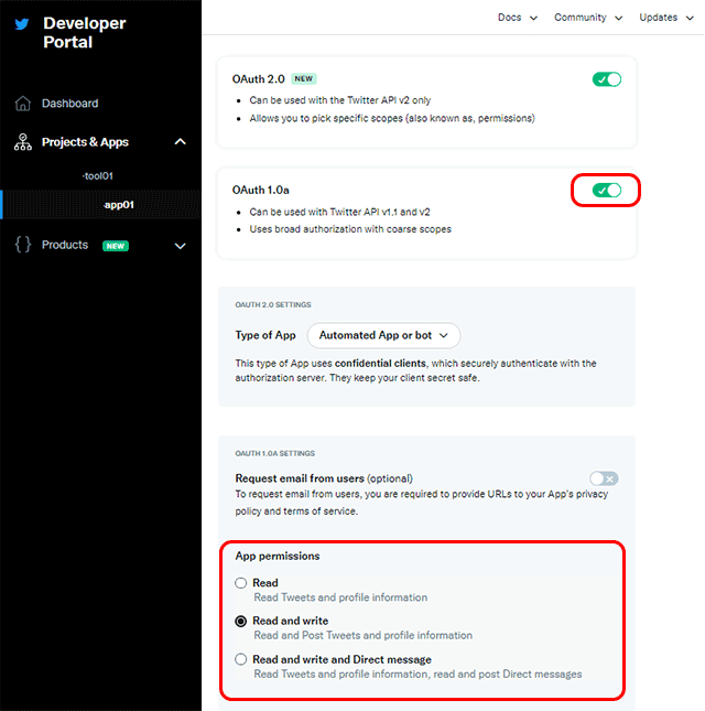 そしたら ReadOnly の Access Token and Secret が発行されてしまいました。設定画面内に ReadOnly とか ReadWrite とかの項目はなかったぞ?と探し回りましたが、まさかの OAuth 1.0a を有効にしないとこの選択肢が出てこない!