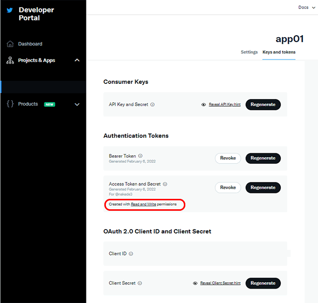 上記 Permission 設定をしてからアプリの Keys and tokens で Access Token and Secret を発行すると(既に発行済みの場合は再発行してください)Permission が反映された Token が得られます。